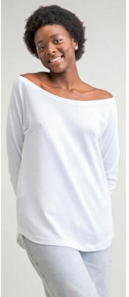 Modern, hosszabb női póló lezser szabással, hosszú raglan ujjakkal és elasztikus bordás mandzsettával. A póló alsó szegélye lekerekített, és a hátsó része pedig kissé hosszabb. Könnyű és fésült organikus biopamutból készült. Divatos, széles csónaknyakú a vállak felett és praktikus, letéphető címkével rendelkezik. A póló oldalsó varrásokkal és dupla varrással rendelkezik.