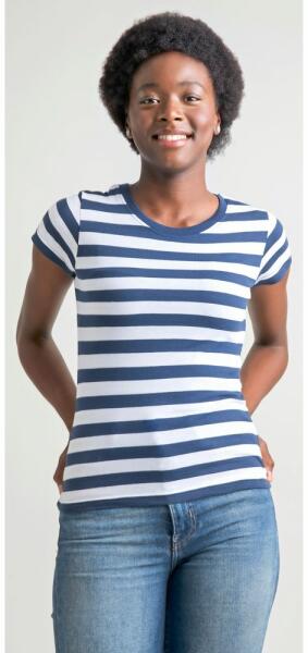 Kényelmes női csíkos póló minőségi organikus biopamutból. Az anyag nagyon puha, sima és kellemes tapintású. A póló klasszikus szabású, oldalsó varrással, és a derékrészen enyhén bevágott, hogy kiemelje a nőies sziluettet. Kerek nyakkivágással rendelkezik és erősítő szalaggal, ami miatt jól tartja az alakját és könnyen felvehető. Az póló ujjai levágottak, a szegélyek pedig dupla varrással készültek.