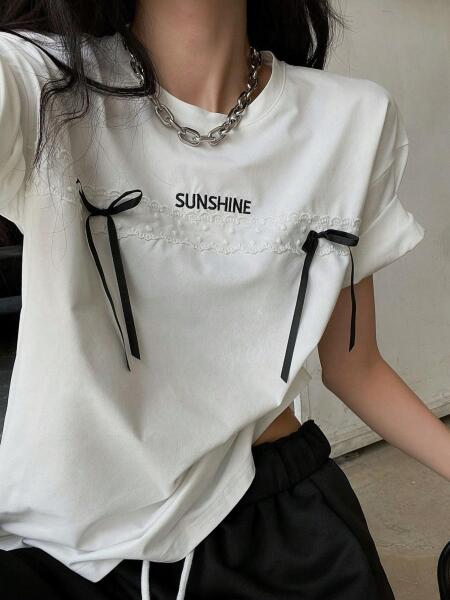Shein Dazy Póló Ecru Casual Hímzett Csipke Masni 38 M__MALLEGRO